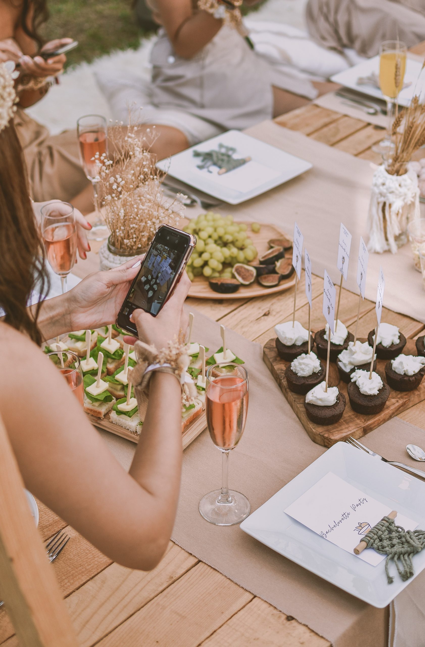 With the casual bohemian vibe, a 5-course meal seems out of place. Some good food options are charcuterie boards, finger sandwiches, a fruit platter and individual desserts. If you decide a cake is necessary, then consider having a naked cake.