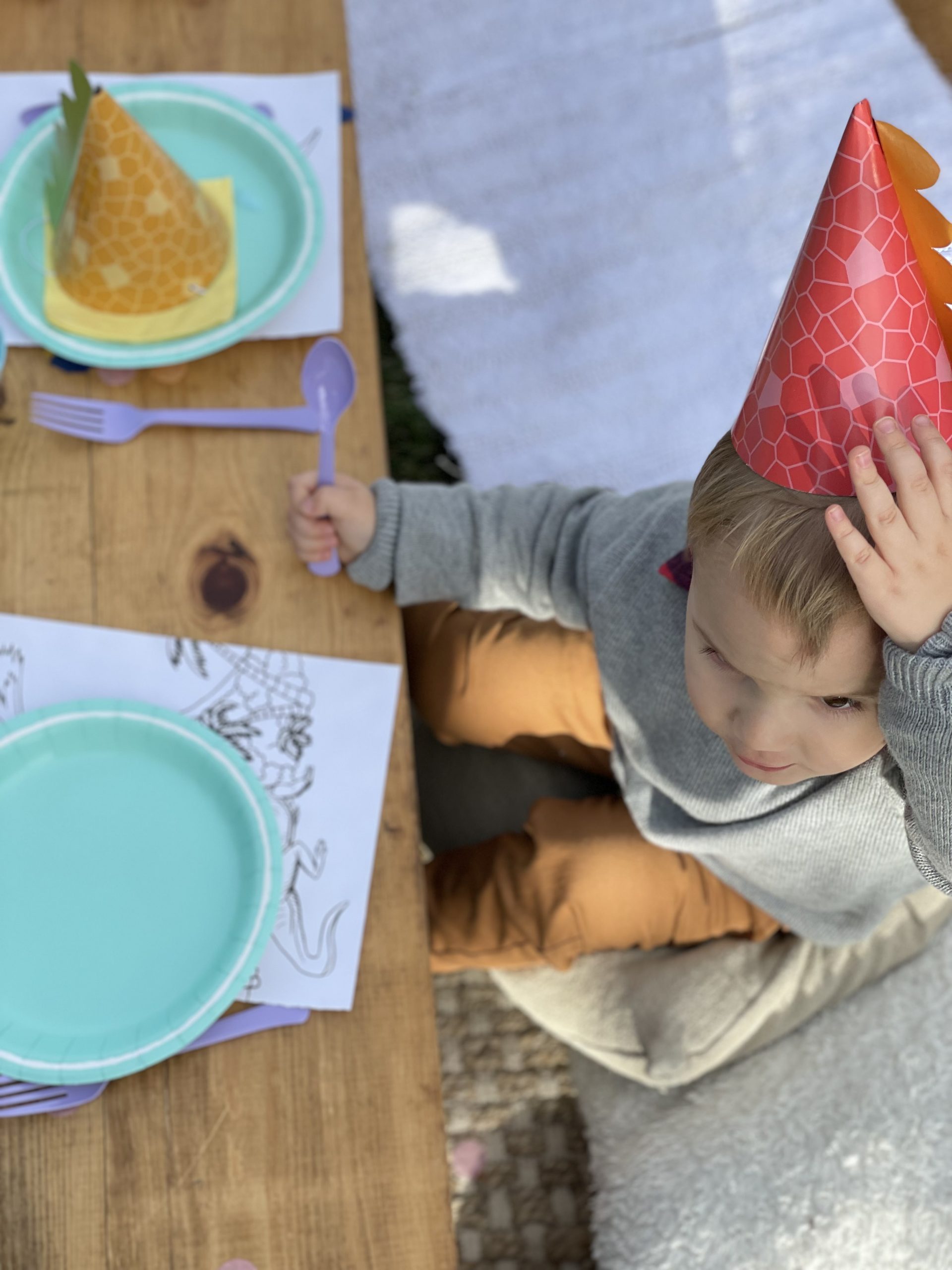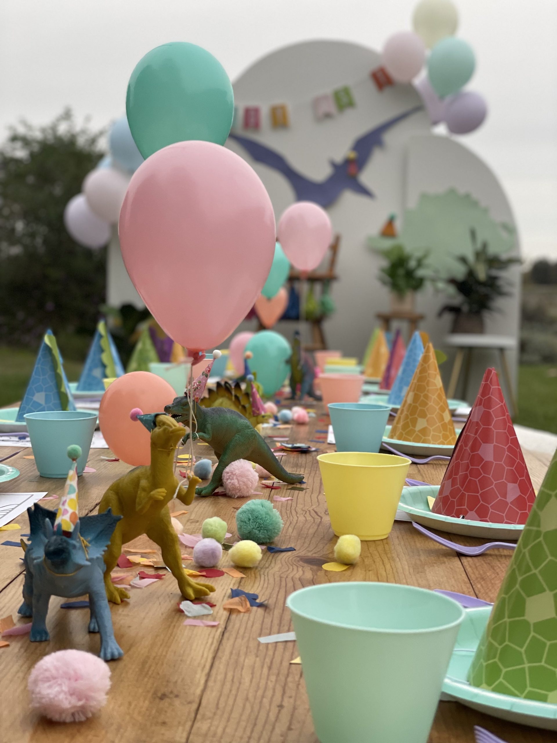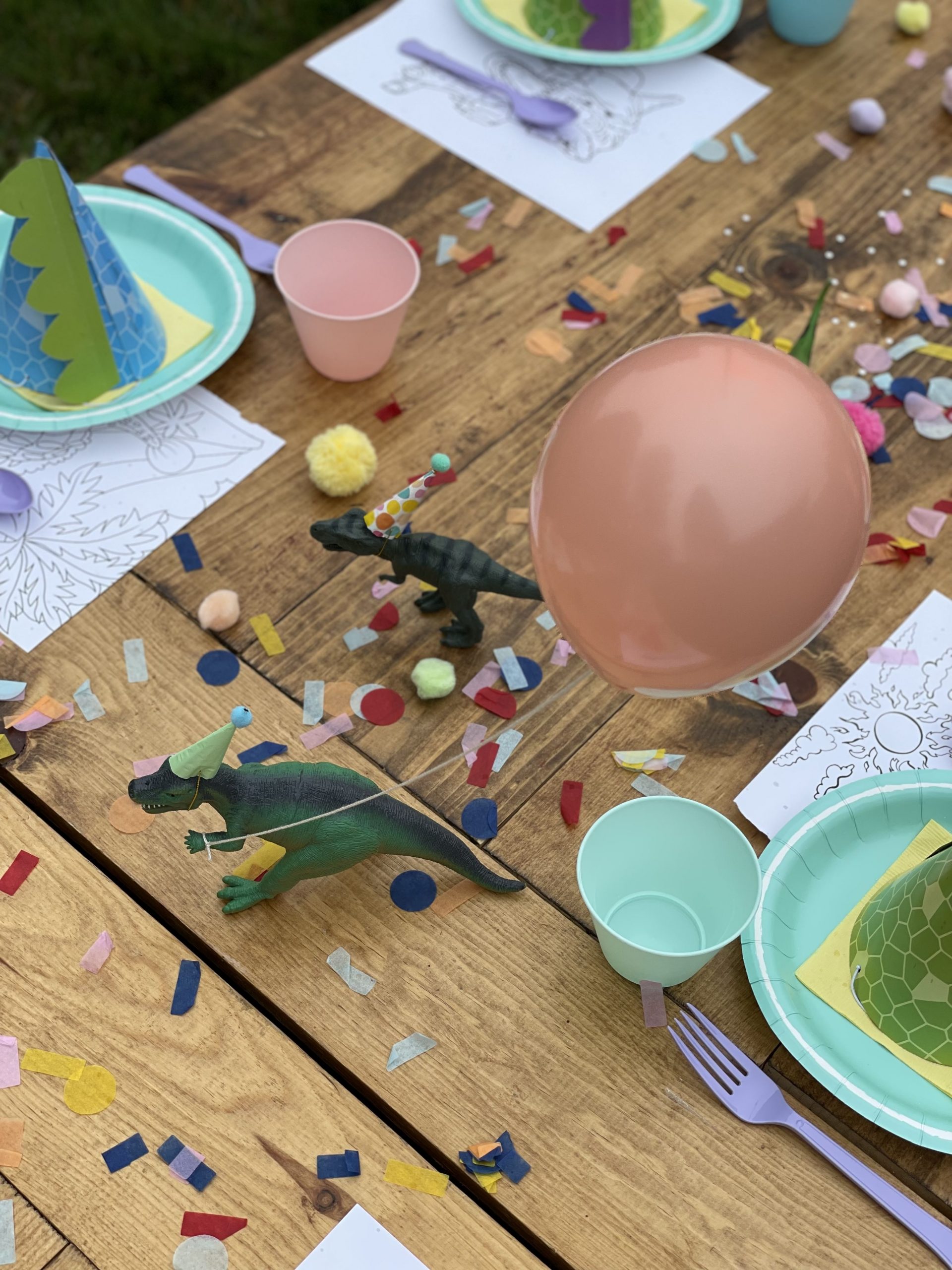 Onto perhaps maybe the most fun part of the party design, the kids table! In addition to the pastel disposable cups, napkins, plates and flatware, I purchased a few more fun sensory and colorful items to add to the overall table design. The most impactful was the dinosaur figures which were gifted a while back and didn’t cost me a cent! To make the normally ferocious dinosaurs look more cute and kid friendly, I topped them off with the most adorable tiny party hats from an Etsy shop! I couldn’t resist buying some but also made a few myself. Of course my DIY party hats weren’t as nice looking but still looked cute and saved me some cash. My FAVORITE detail has got to be the tiny helium balloons that we tied to a few of the dinosaurs and it made it look like they were holding the balloons. These party animals behaved so well they didn’t even bite anyone. In addition to the dinos I spread out fluffy pom poms and colorful confetti across the middle to create a table runner like effect. End result was super fun and colorful and added a lot of dimension to the table! I also added a kids dinosaur party hat on each plate which also added dimension to the table but was also very fun for the kids to wear. Lastly, what’s a kids table without some coloring options! Under each plate and cup I placed a dinosaur coloring page almost like a placemat, added crayons throughout the tables and that’s it! The kids table turned out BEYOND ADORABLE! The end result was cute and actually practical for kids! They enjoyed the dinosaur figures, the pom poms and of course the coloring pages.Â