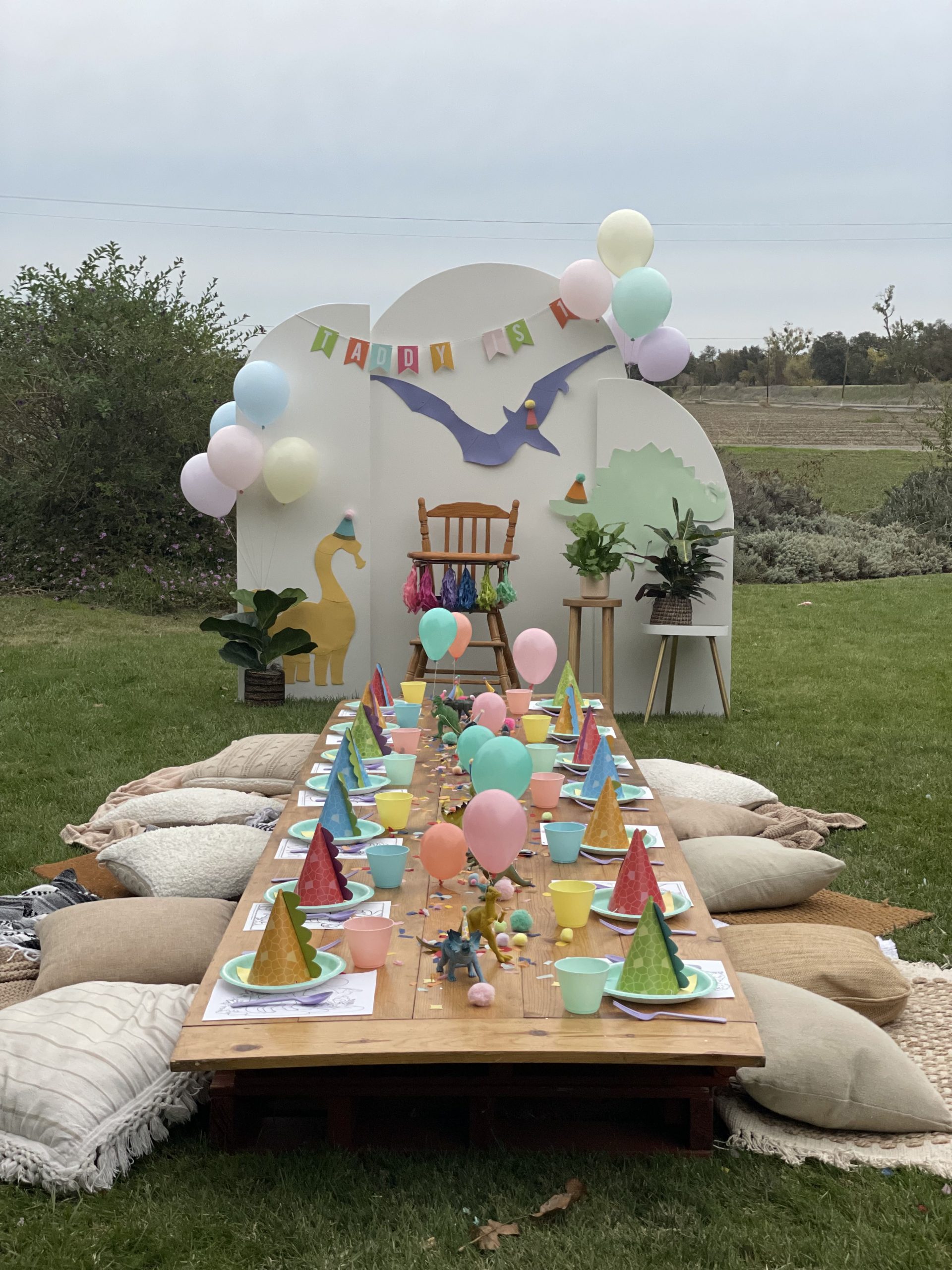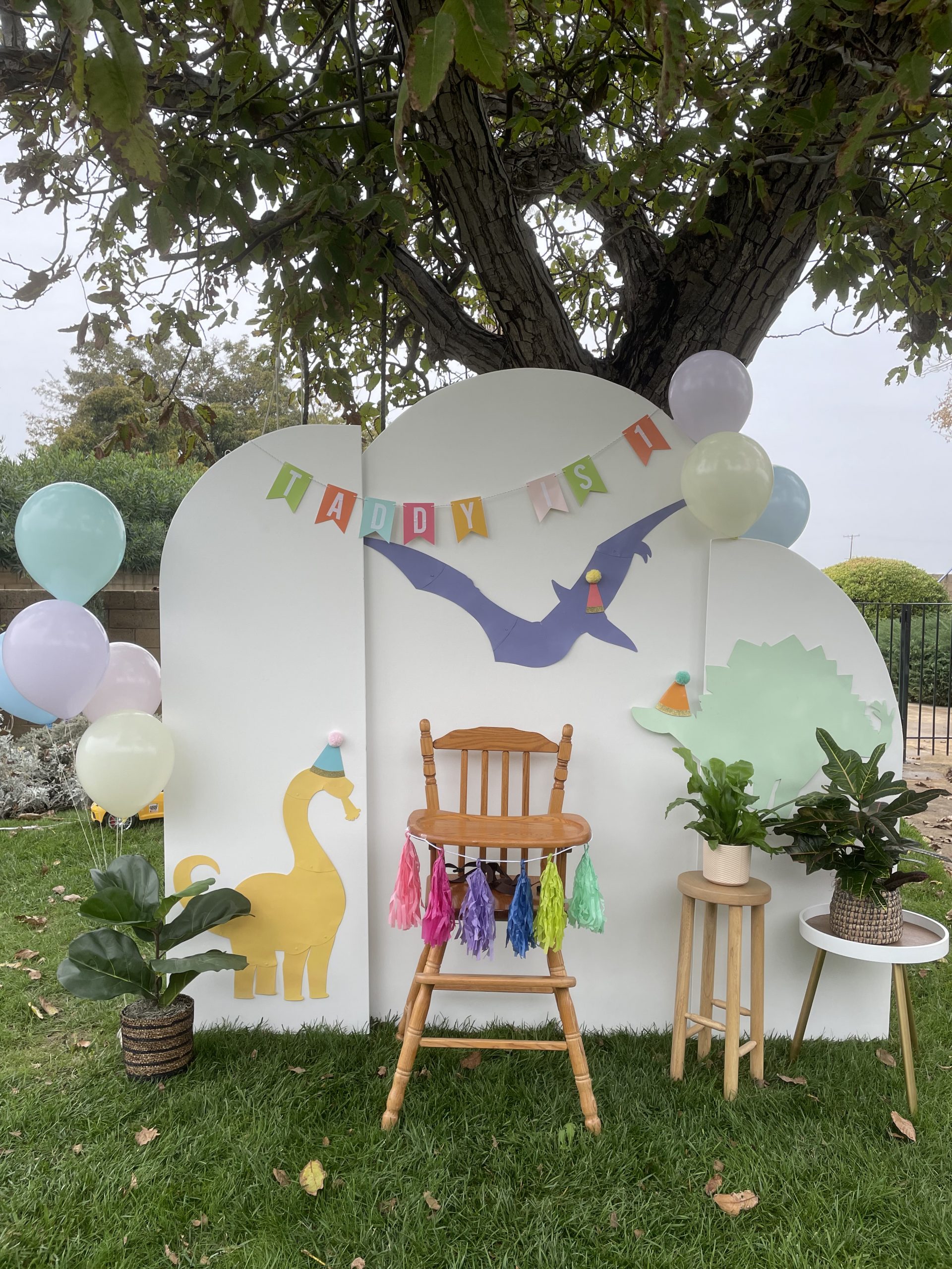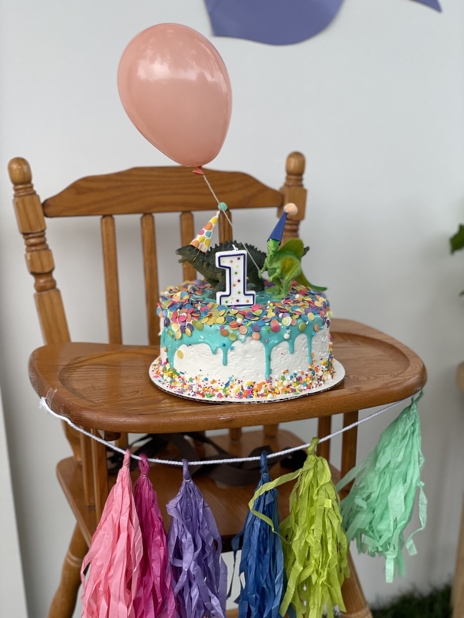Let’s start with the backdrop! I bought the dinosaur cutouts from Dollar Tree and spray painted them in various pastel colors to achieve the “minimalist cutesy dino look”. Then, I topped them off with fun party hats from Target that I cut in half and attached to the dinos to which I added a 3D-sensory element by adding pom poms to the tops of the party hats. No party is complete without a birthday banner so I found the perfect pastel banner where I was able to use sticker letters to customize the wording. For the finishing touches, I ordered helium balloons to frame the backdrop instead of making a balloon garland. Don’t get me wrong, I LOVE a good balloon garland and I hope they never go out of style but there’s something about classic helium balloons that is so cute and nostalgic. They are also a cheaper balloon option and were a huge hit with the kiddos too! Little ones always love to play with helium balloons 🙂 It’s not a first birthday without a highchair. It’s perfect to place the smash cake on and keep the little one in place for photos. I kept the high chair decorations pretty simply and just added a cute little tassel garland across the front, of course also in pastel tones. Then to finish off the backdrop, I added some real and faux plants from around the house for a Jurassic and tropical look to the design but still keeping with the overall minimalist look I was going for. Overall the backdrop turned out visually simple and not overstimulating yet fun and amusing for the little ones and guests!