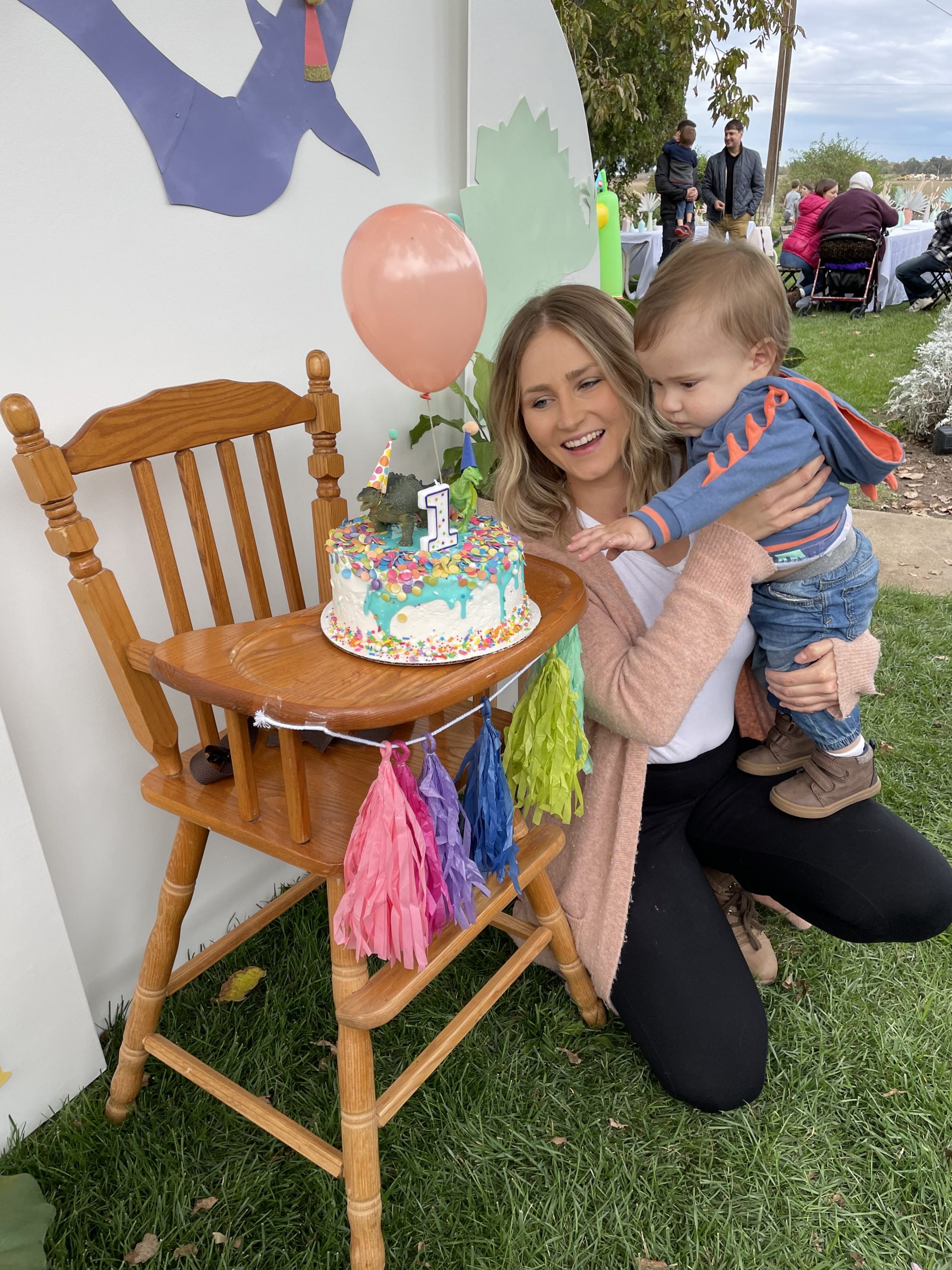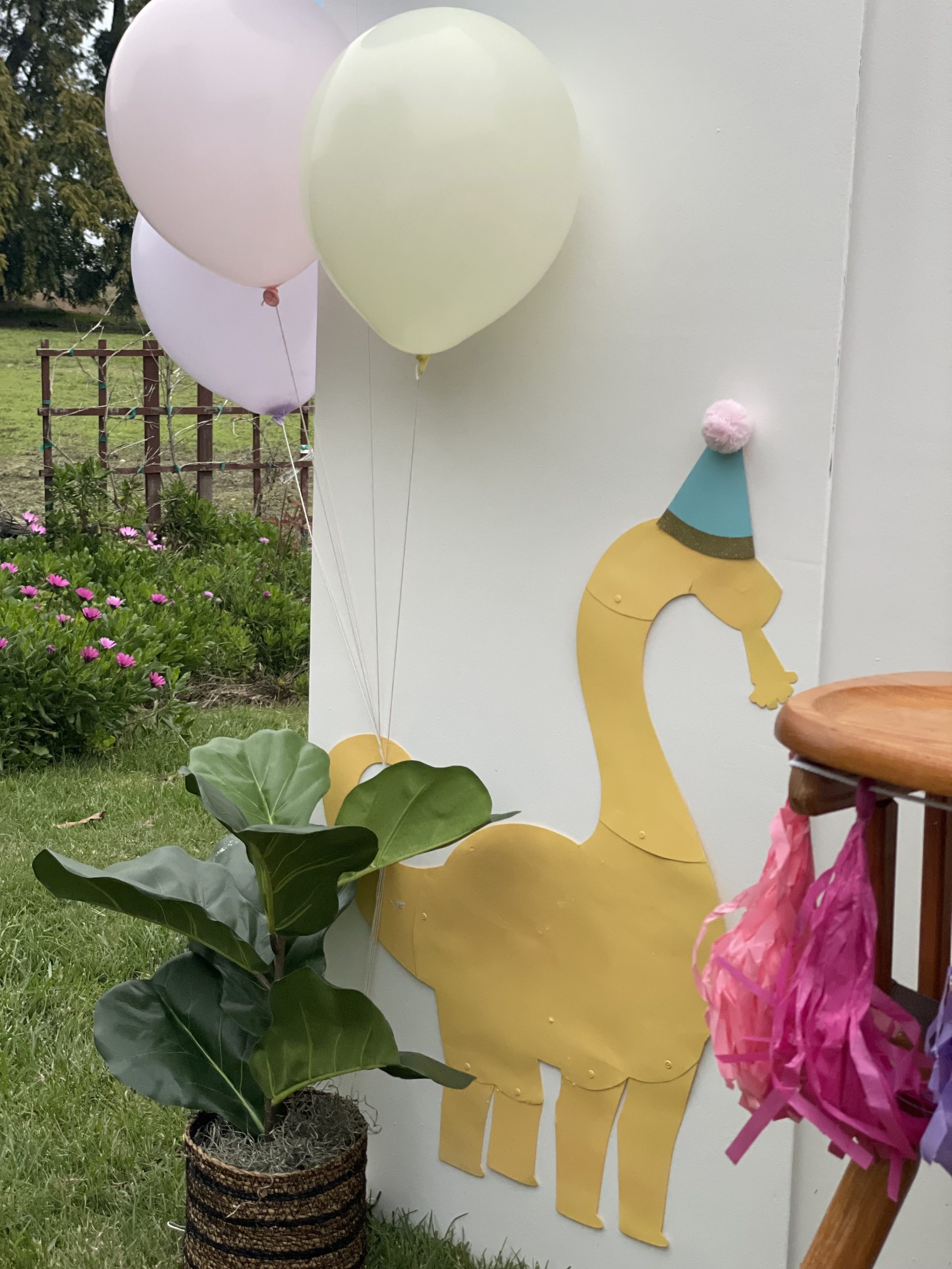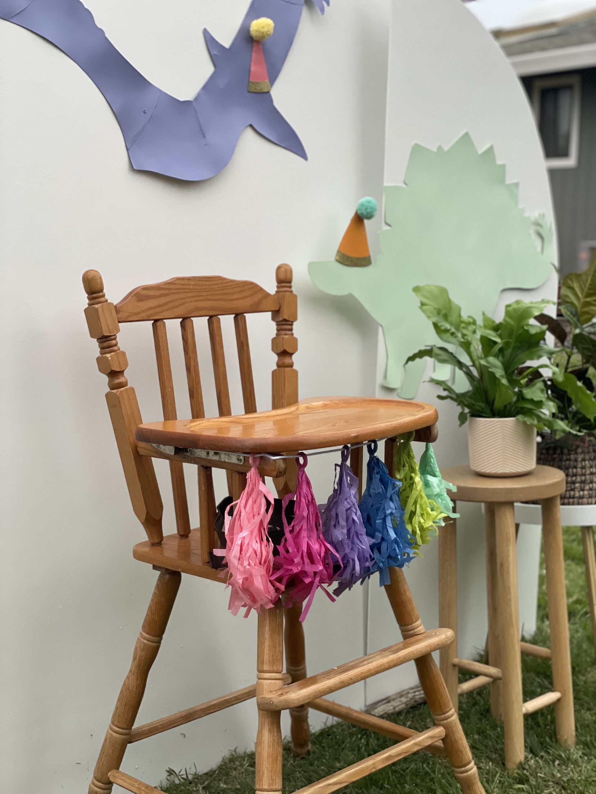 Let’s start with the backdrop! I bought the dinosaur cutouts from Dollar Tree and spray painted them in various pastel colors to achieve the “minimalist cutesy dino look”. Then, I topped them off with fun party hats from Target that I cut in half and attached to the dinos to which I added a 3D-sensory element by adding pom poms to the tops of the party hats. No party is complete without a birthday banner so I found the perfect pastel banner where I was able to use sticker letters to customize the wording. For the finishing touches, I ordered helium balloons to frame the backdrop instead of making a balloon garland. Don’t get me wrong, I LOVE a good balloon garland and I hope they never go out of style but there’s something about classic helium balloons that is so cute and nostalgic. They are also a cheaper balloon option and were a huge hit with the kiddos too! Little ones always love to play with helium balloons 🙂 It’s not a first birthday without a highchair. It’s perfect to place the smash cake on and keep the little one in place for photos. I kept the high chair decorations pretty simply and just added a cute little tassel garland across the front, of course also in pastel tones. Then to finish off the backdrop, I added some real and faux plants from around the house for a Jurassic and tropical look to the design but still keeping with the overall minimalist look I was going for. Overall the backdrop turned out visually simple and not overstimulating yet fun and amusing for the little ones and guests!