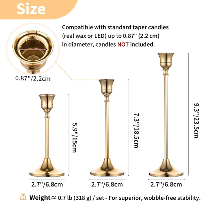 Set of 3 Brass Gold Metal Taper Candle Holders. Candles not included.