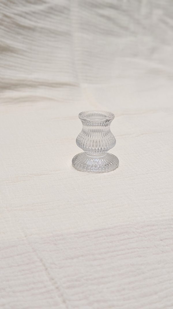 Elegant ribbed candle holder that can be paired with a hurricane vase could be used together or separate. Dripless candles are highly recommended. All items must be cleaned before returning.