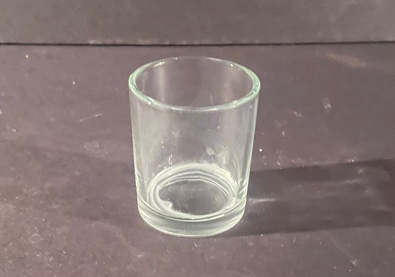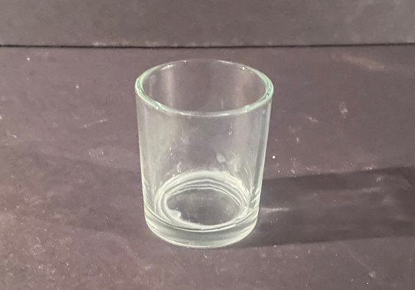 Small clear votives. Works with tea light candles. We recommend 6 per guest table.
