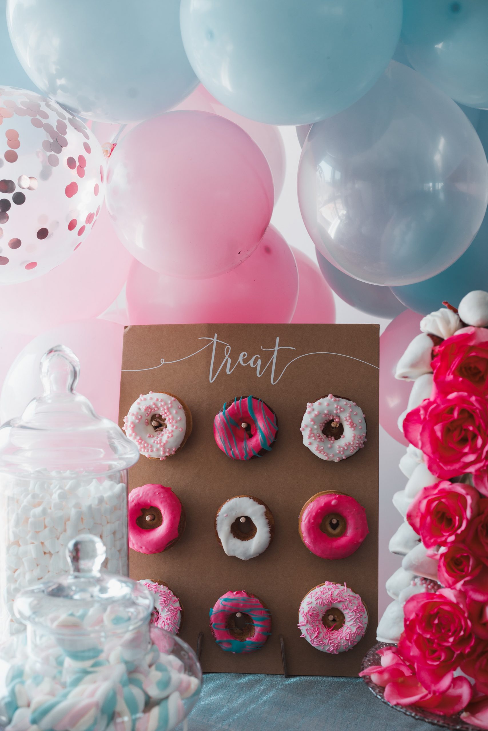 Everyone loves desserts! Whatever color combo you choose for your gender reveal, I’m sure you can find candies and desserts in that color. You can also add whatever color of sprinkles on to white frosted donuts to match the color theme. Some dessert options are cake pops, frosted sugar cookies, and chocolate covered strawberries.