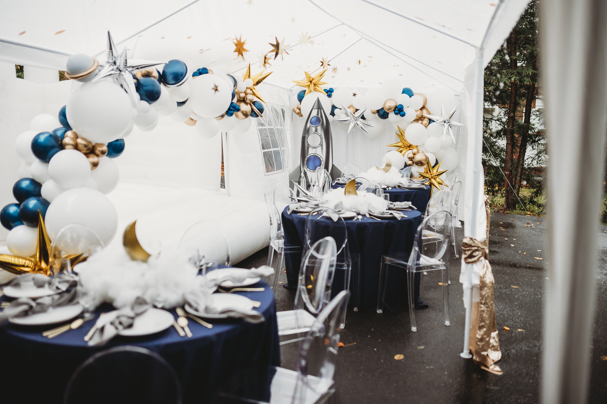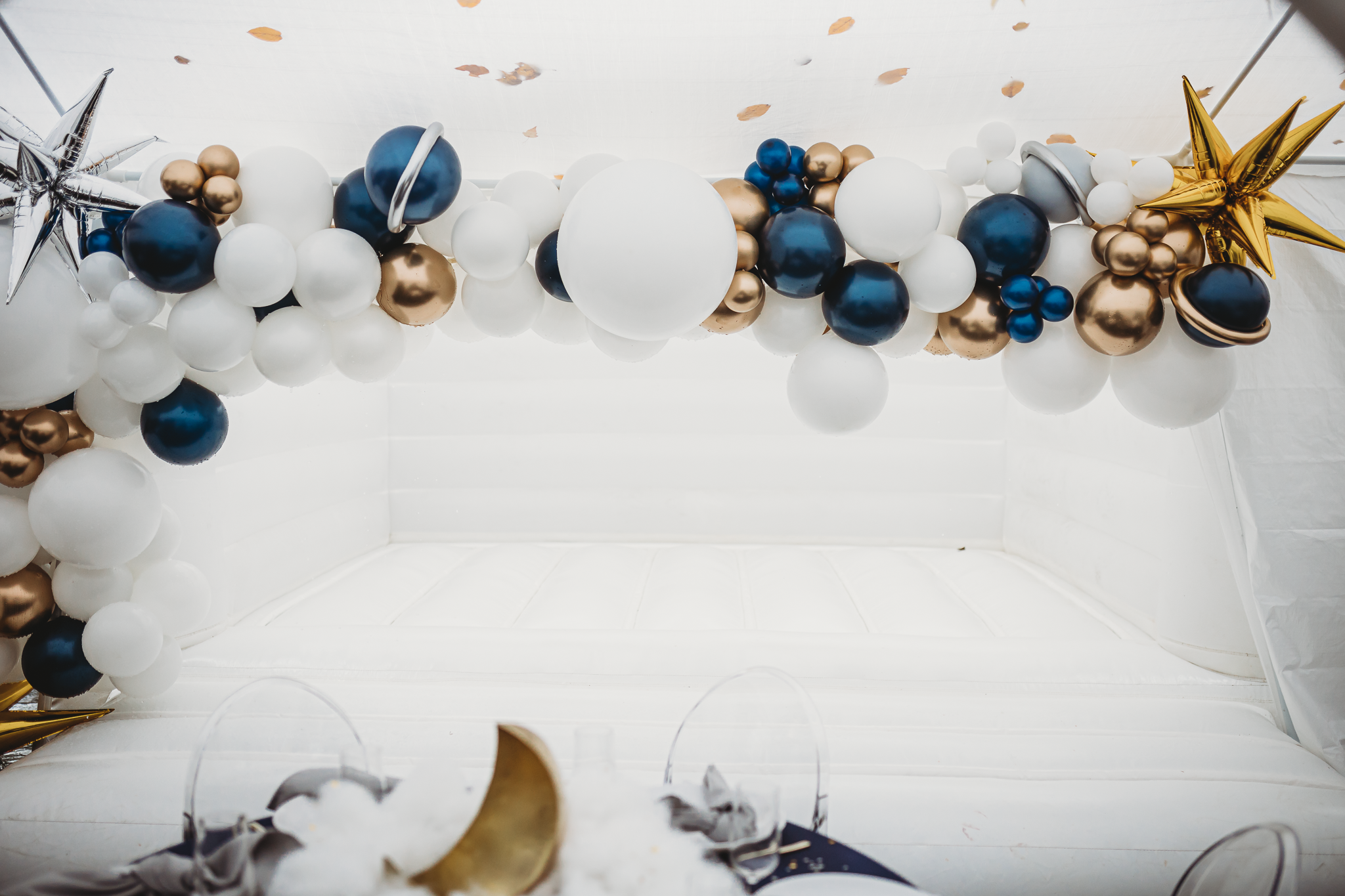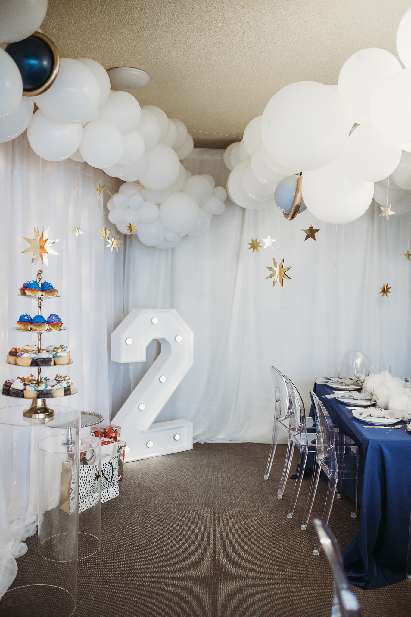 Royal Rentals provided most rentals and decorations including backdrops, tables, chairs, a tent, plate settings and heaters creating the base for custom decor and personalized touches. We also created custom centerpieces with gold metal moons and lit fluffy clouds. Other local rental vendors provided the luxury white bounce house, easel, marquee number, glass top TWO table, wooden moon prop and elegant clear chairs.
