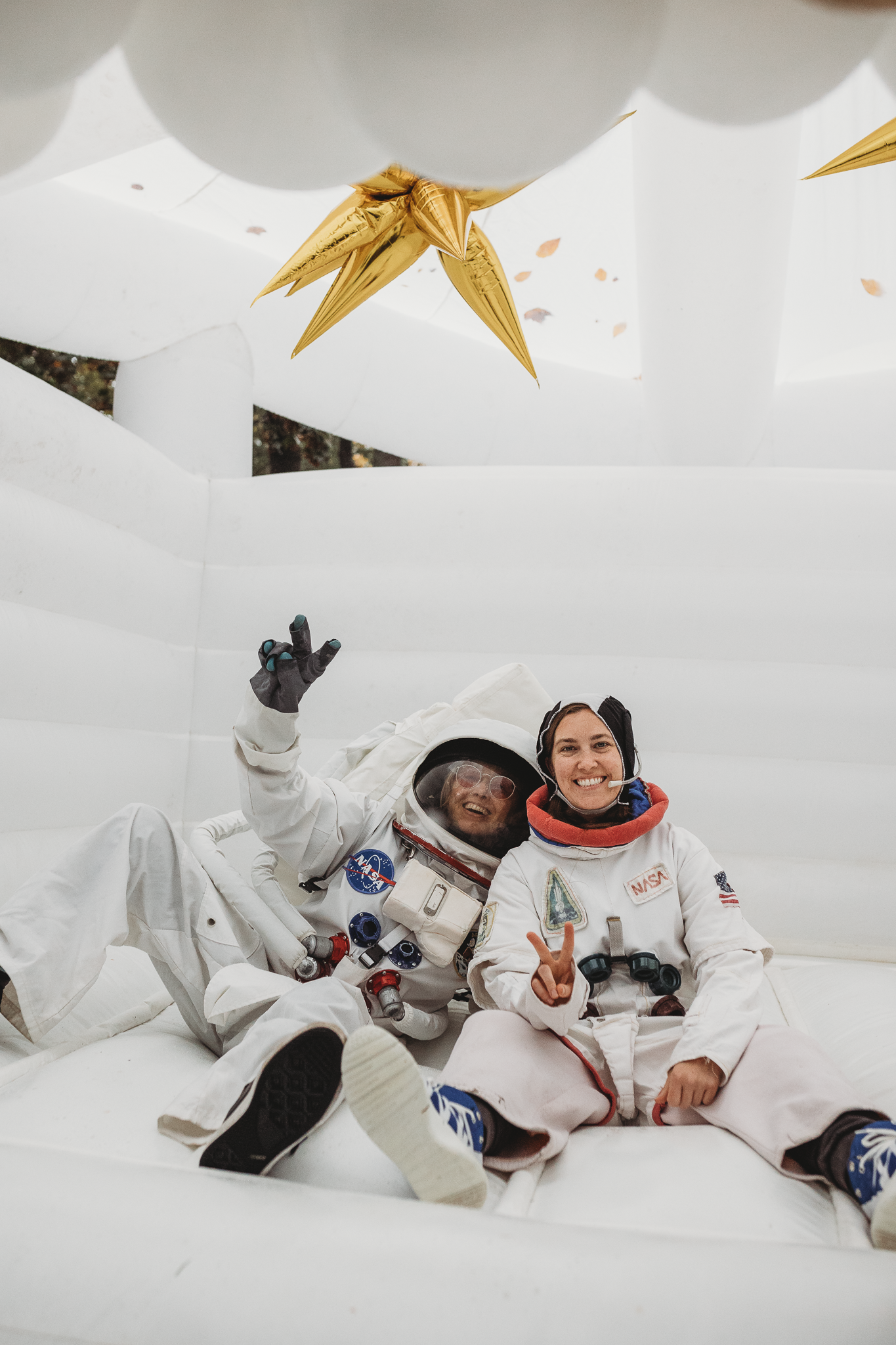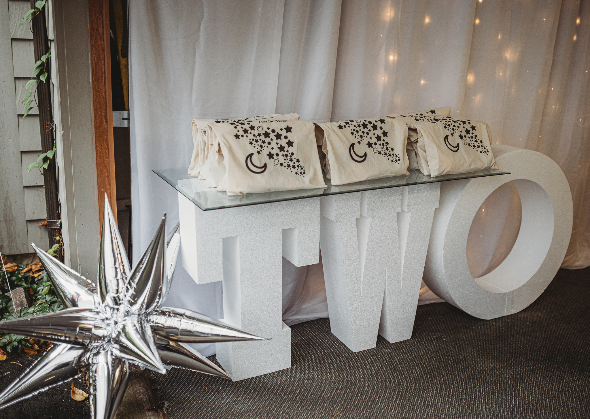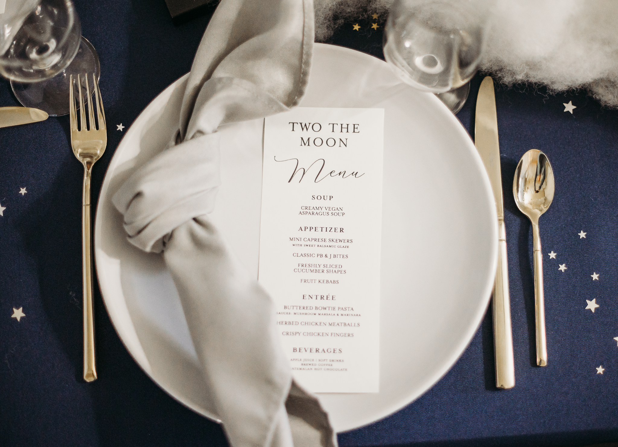 Royal Rentals provided most rentals and decorations including backdrops, tables, chairs, a tent, plate settings and heaters creating the base for custom decor and personalized touches. We also created custom centerpieces with gold metal moons and lit fluffy clouds. Other local rental vendors provided the luxury white bounce house, easel, marquee number, glass top TWO table, wooden moon prop and elegant clear chairs.